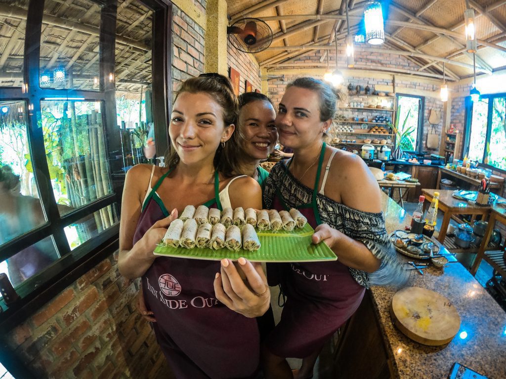 Have a short time for kayaking in the bay. Check out the cabin, your bags can be left in luggage store. Join in the Cooking Class to learn how to make our specifically (Spring rolls) before an early lunch is served.