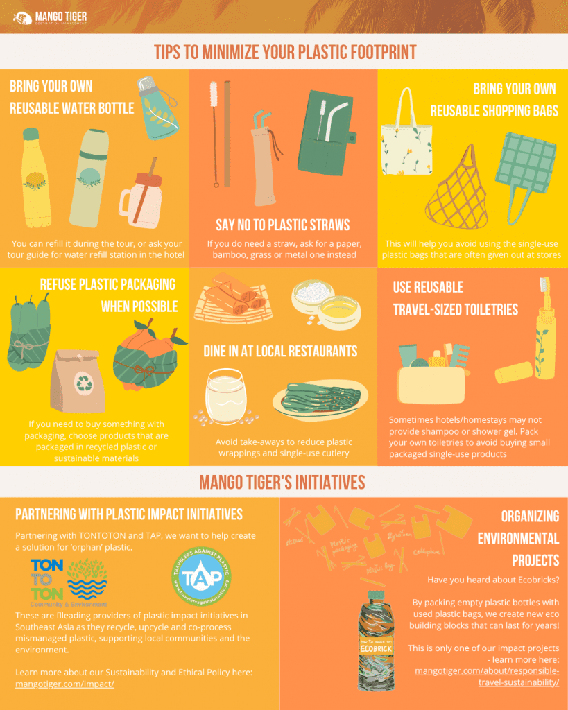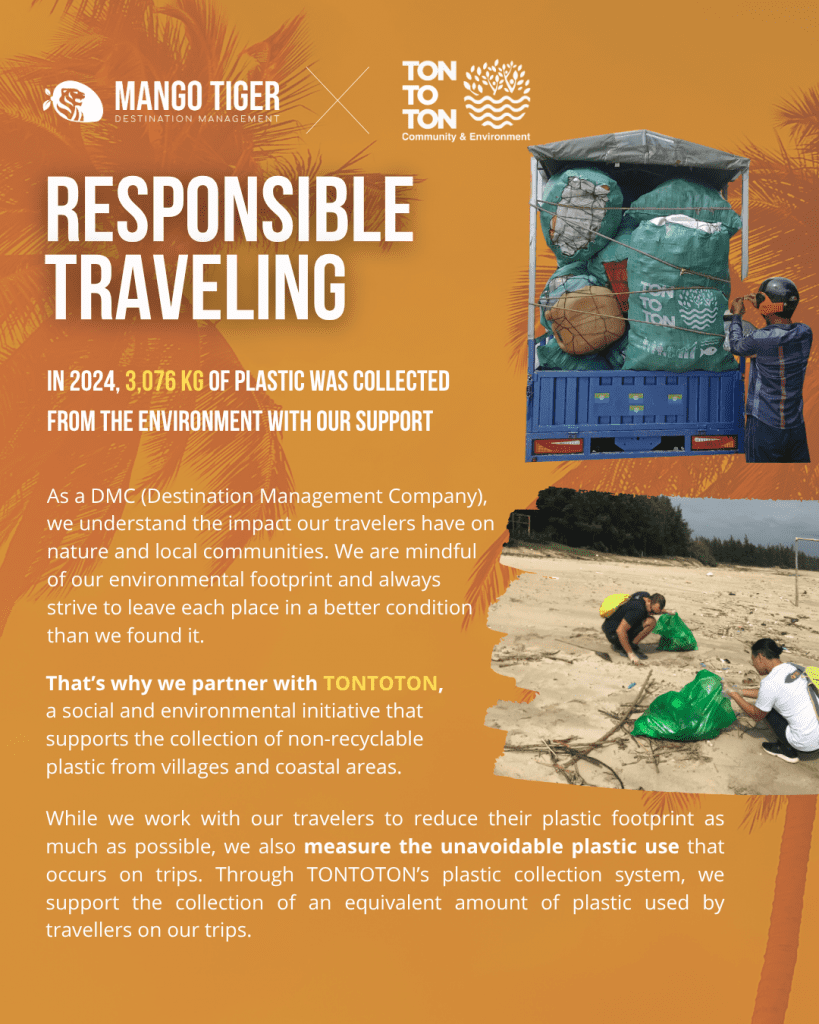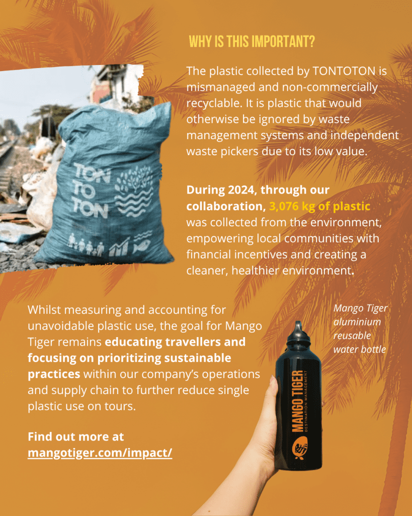 An issue always close to our hearts, Mango Tiger is in the process of becoming the first plastic neutral EMC working with internationally accredited auditors to purchase plastic units to offset every one of our customers’ plastic use throughout their tours with us.